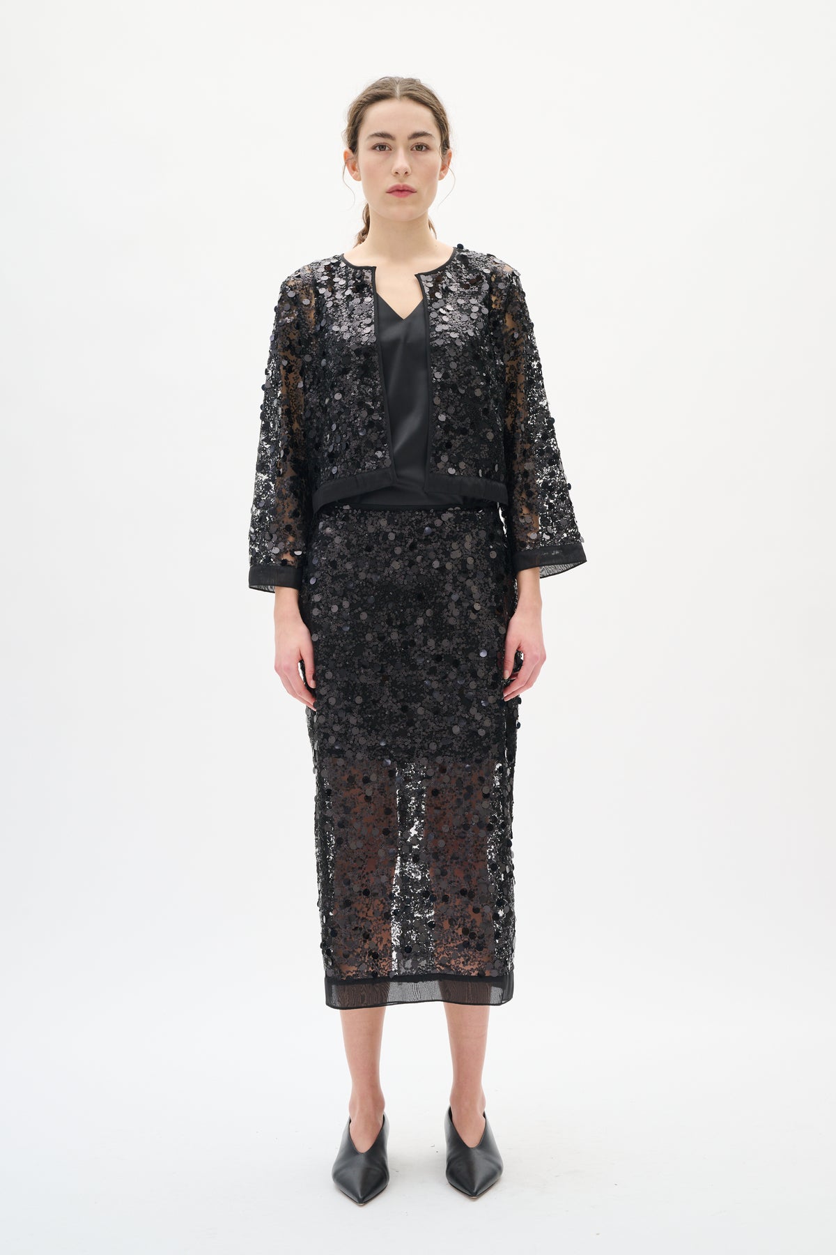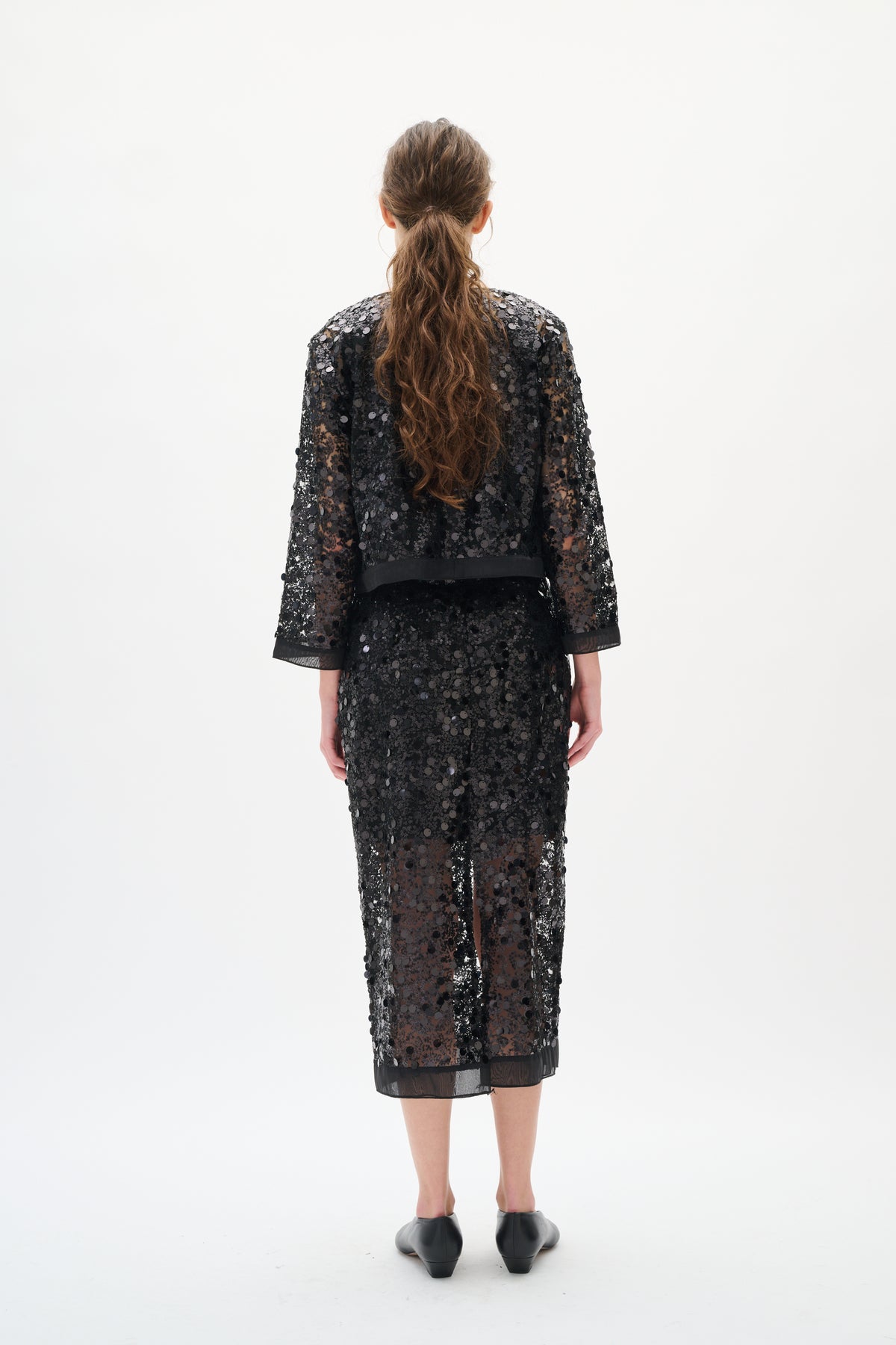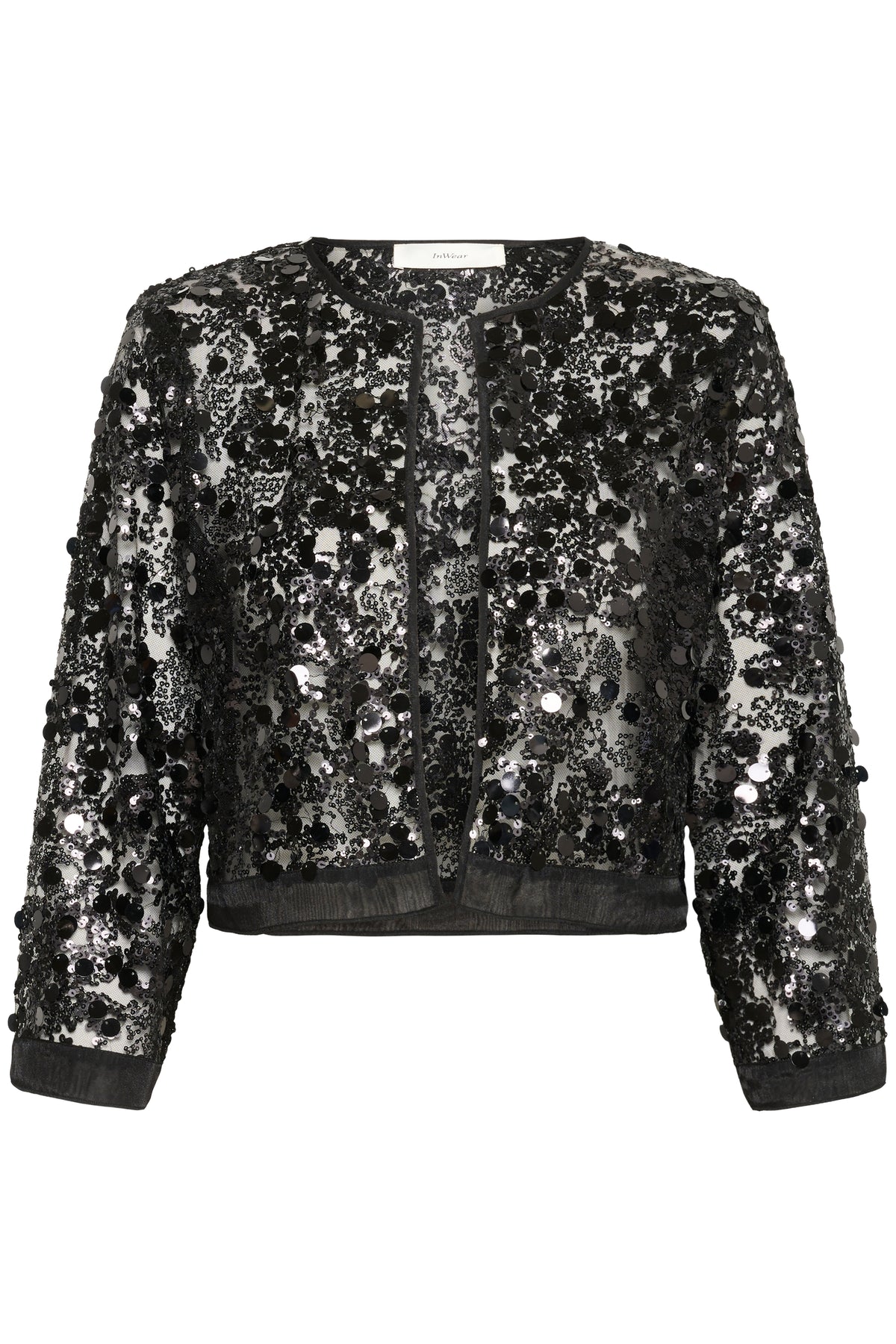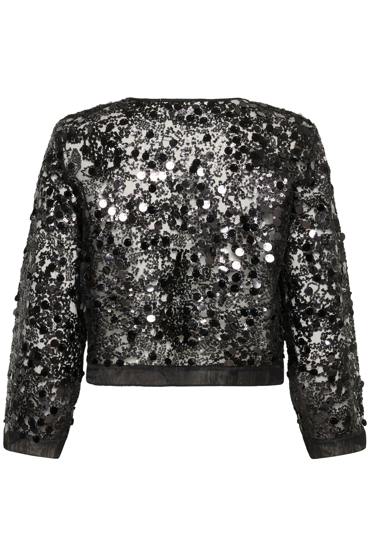 Boléro à manches 7/8 orné de paillettes de tailles variées.