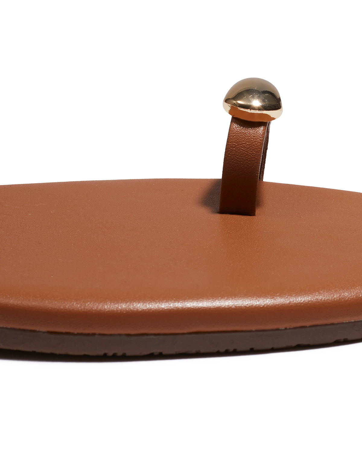 Sandale plate à bout carré avec une lanière asymétrique et une bague d'orteil rehaussée d'un détail métallique.