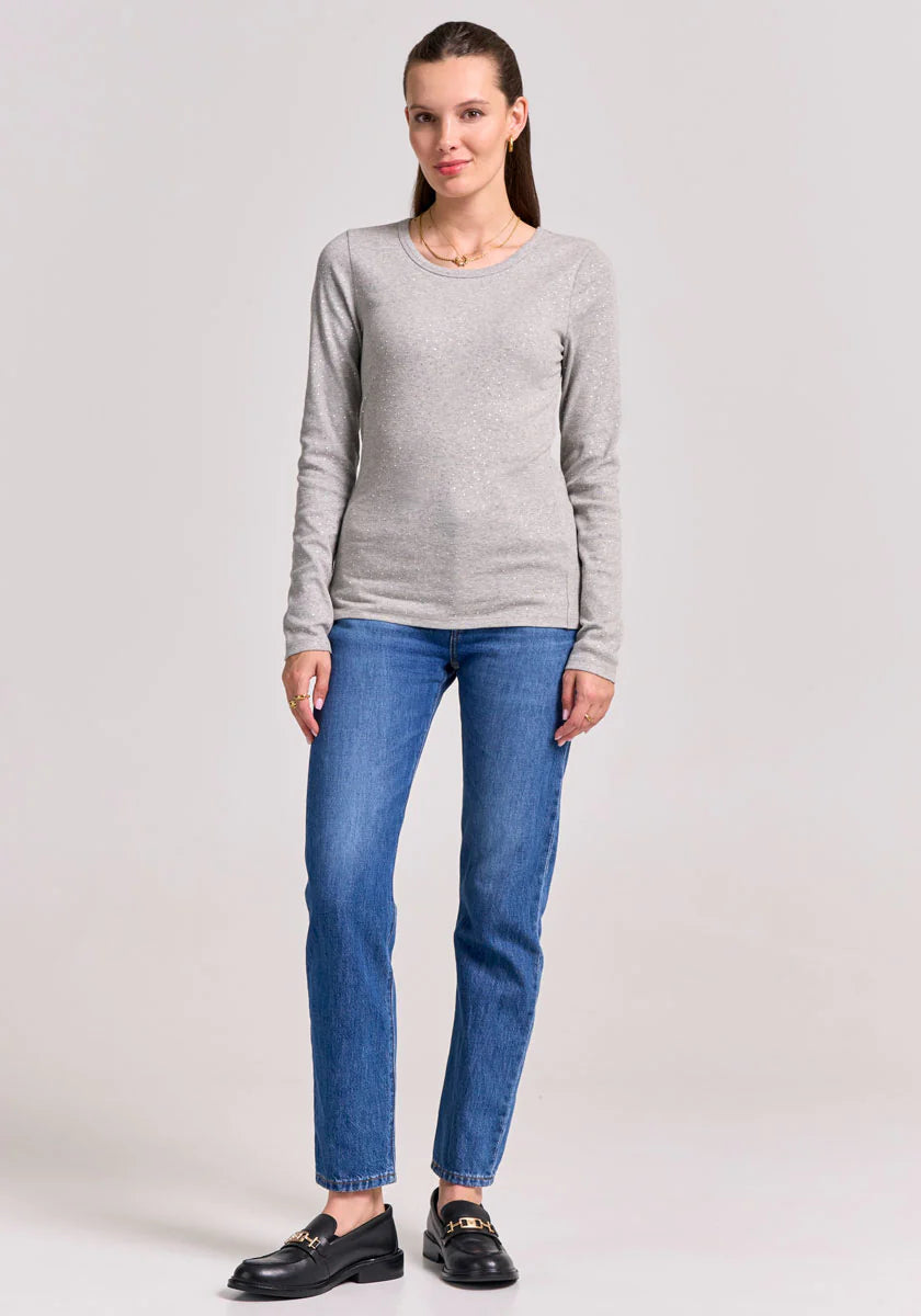 Ce t-shirt à manches longues offre une coupe flatteuse. Les petites pierres scintillantes ajoutent une touche d'éclat discrète. Le col rond classique et les manches longues en font une pièce polyvalente et confortable, parfaite pour un look de jour ou de soirée, ajoutant une note d'élégance.