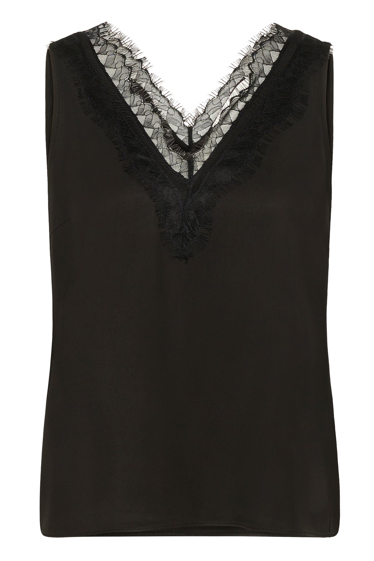 Camisole soyeuse avec col V orné de dentelle et une coupe ample.