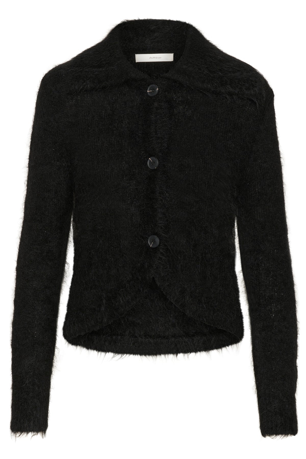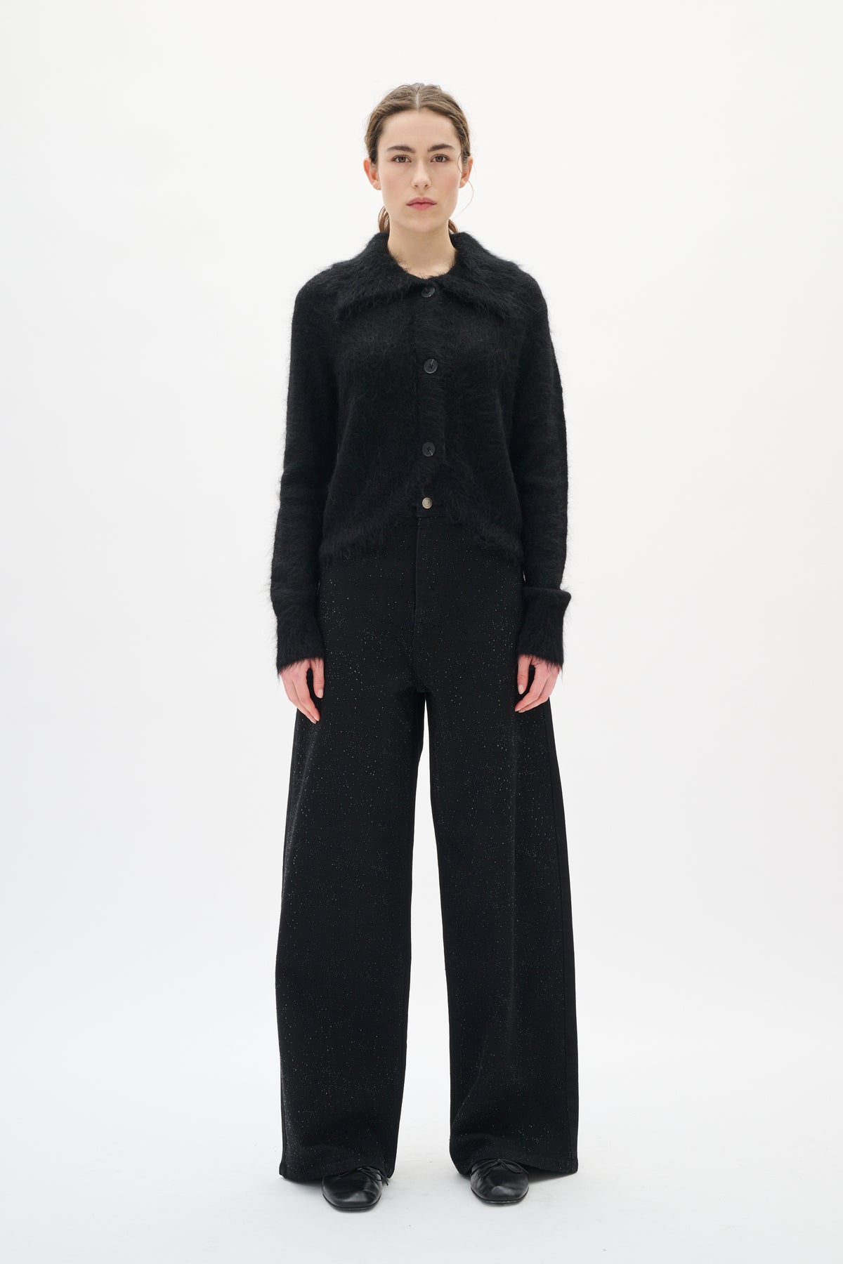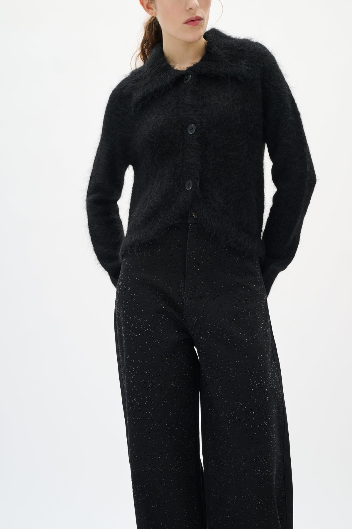 Cardigan boutonné en alpaga à manches longues avec col chemise et coupe ajustée.