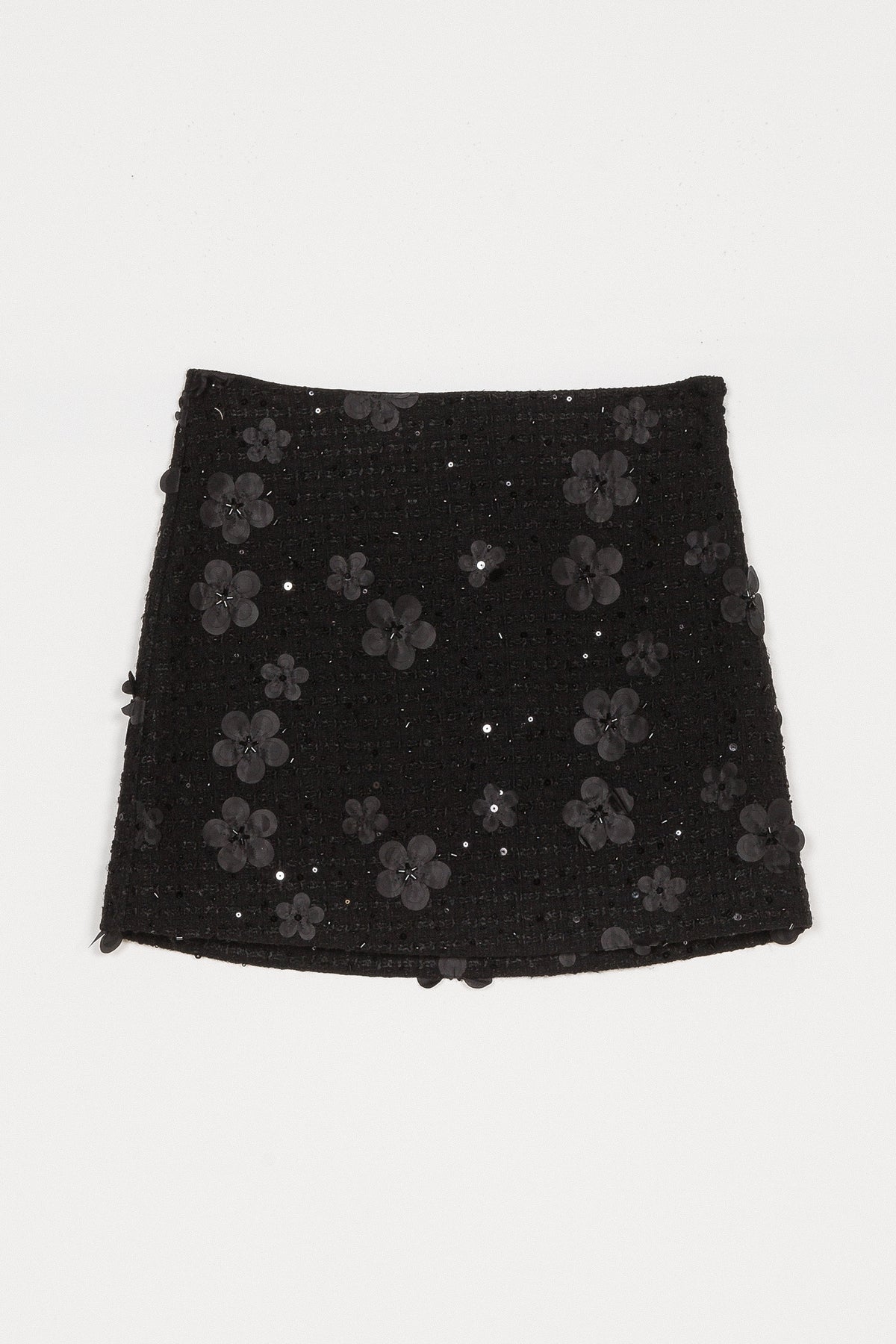Vendu en ensemble. Veston en tissu bouclé orné de perles et de paillettes avec un motif floral, un col rond et à trois boutons. Jupe courte en tissu bouclé avec des fleurs et des paillettes et fermeture éclair latérale.