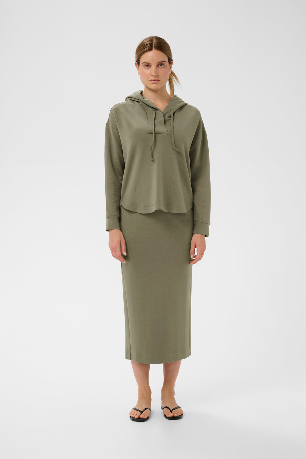 Adoptez le confort avec style grâce à ce hoodie à capuche. Sa coupe décontractée, ses épaules tombantes créent une silhouette moderne et flatteuse. Le col en V avec cordons ajoute une touche distinctive. Agencez-le avec la jupe assortie pour créer un ensemble monochrome parfait ou avec votre jean favori pour un look décontracté.
